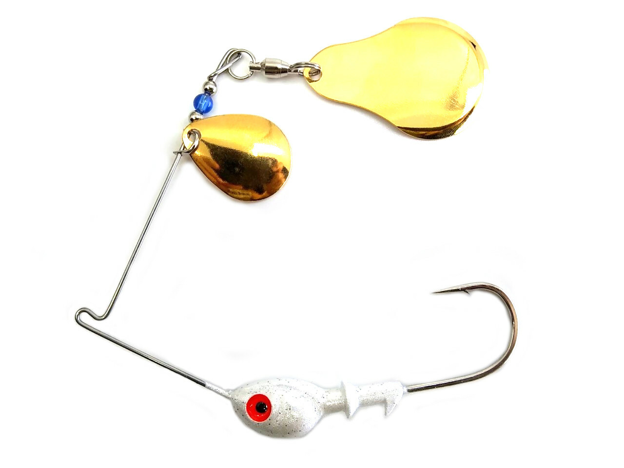 Spinnerbait Features Gold Colorado Plain Blades on the front and Gold Chopper Plain Blades on the back with your choice of skirt color. Head Weight available in 3/8 oz. or 1/2 oz. * All Spinnerbaits Feature Pearl White Hologram Flake Heads with Flourecent Red/Black Dot Eye.
