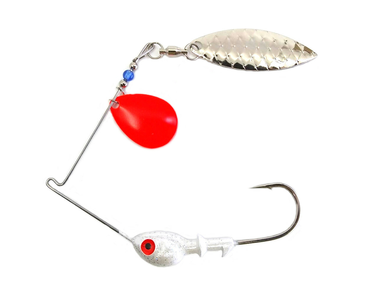 Spinnerbait Features a Colorado Red Blade on the front and a Willow Nickel Scale Blade on the back with your choice of skirt color. Head Weight available in 1/4 oz. 3/8 oz. 1/2 oz. or 3/4 oz. * All Spinnerbaits Feature Pearl White Hologram Flake Heads with Flourecent Red/Black Dot Eye.