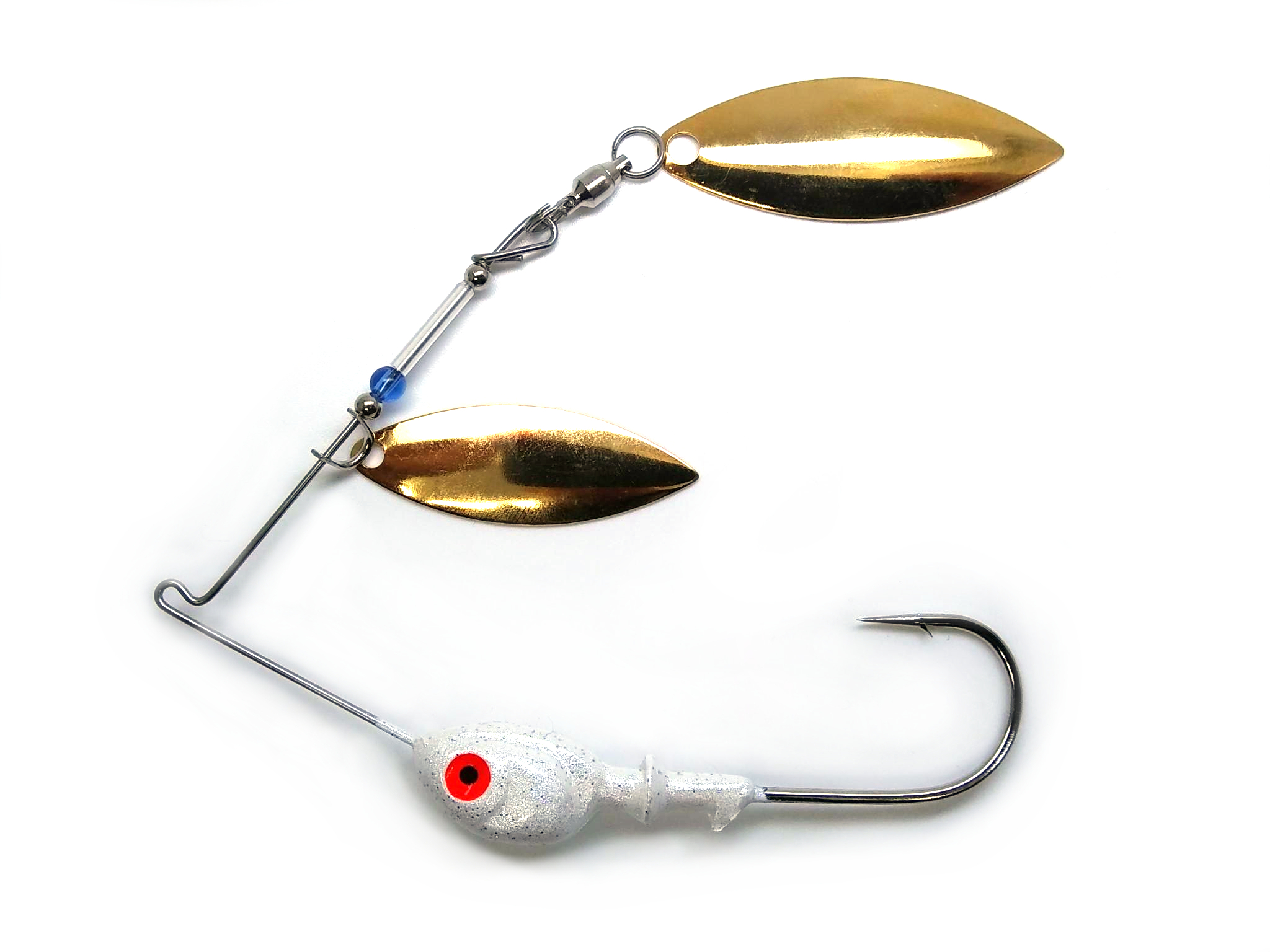Spinnerbait Features Gold Willow Plain Blades on the front and back with your choice of skirt color. Head Weight available in 1/4 oz. 3/8 oz. 1/2 oz. or 3/4 oz. * All Spinnerbaits Feature Pearl White Hologram Flake Heads with Flourescent Red/Black Dot Eye.