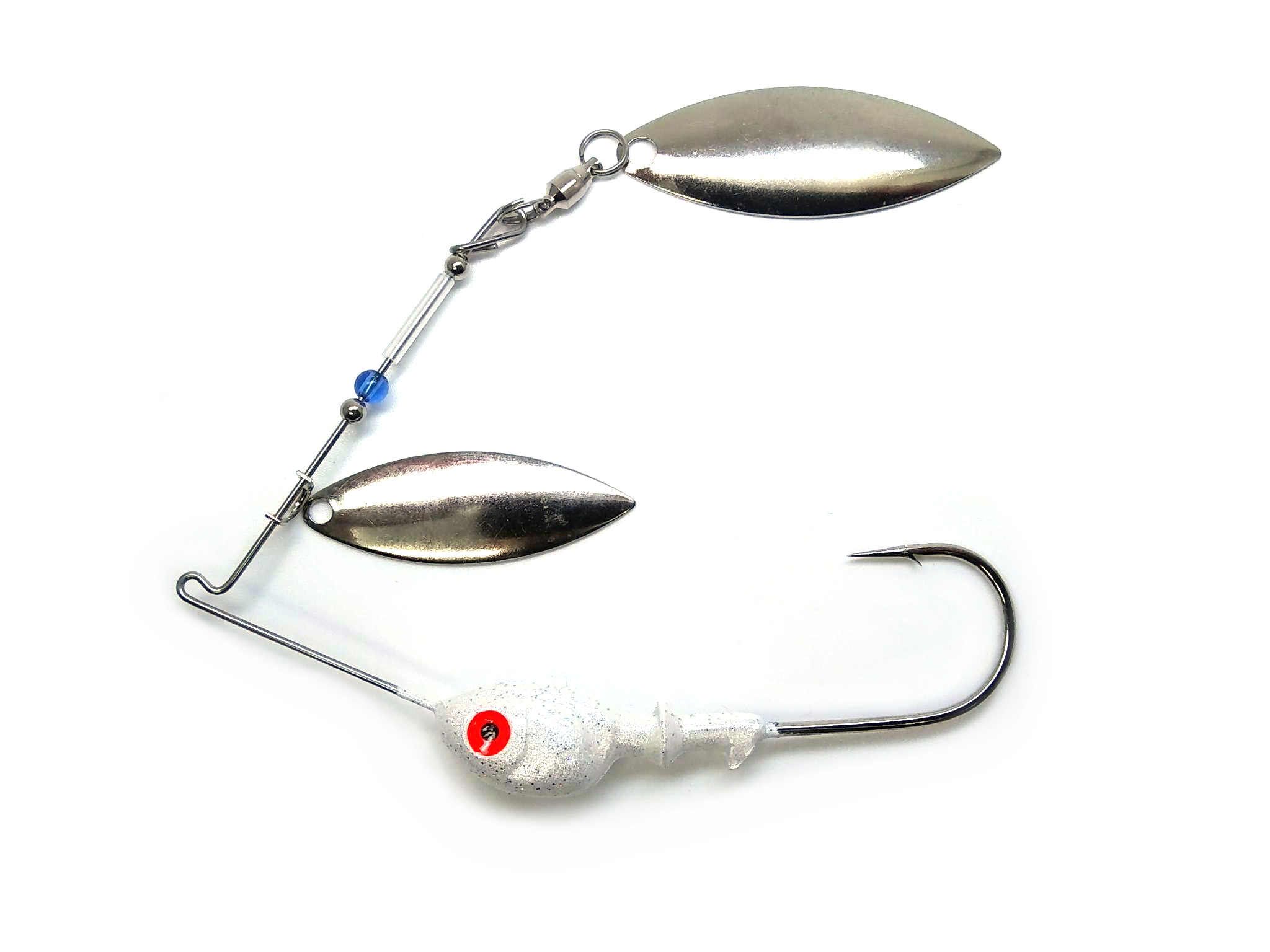 Spinnerbait Features Nickel Willow Plain Blades on the front and back with your choice of skirt color. Head Weight available in 1/4 oz. 3/8 oz. 1/2 oz. or 3/4 oz. * All Spinnerbaits Feature Pearl White Hologram Flake Heads with Flourecent Red/Black Dot Eye.